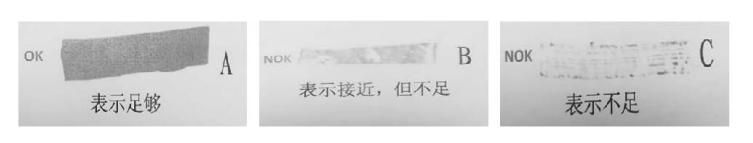 達(dá)因筆在材料表面上的擴(kuò)散程度是由材料表面的清潔程度所決定的。材料表面的清潔程度如圖A中所示,材料表面沒(méi)有雜質(zhì),達(dá)因筆在材料表面涂抹后易流動(dòng)和擴(kuò)散,并涂滿了材料表面不平的表面。而在圖BC中,由于材料表面有雜質(zhì),達(dá)因筆涂抹后并不能和材料表面完全重合, 材料表面留有一定的空穴,達(dá)因筆在材料表面難以擴(kuò)散。由于材料表面的清潔程度不同,達(dá)因筆與材料表面接觸的面積就不同,利用涂抹的面積大小就能檢測(cè)出材料表面的清潔程度,使用達(dá)因筆檢測(cè)是間接量化材料表面潔凈程度和表面處理效果的檢測(cè)方法。